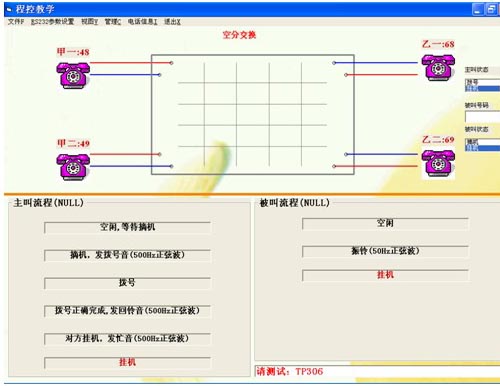 本教学软件通过计算机串口和YYM-86U实验箱连接,可以配合进行程控实验,形象地对当前状态进行实时演示,并提示当前实验步骤的测量点。还可对电话的各种状态和数据进行统计。